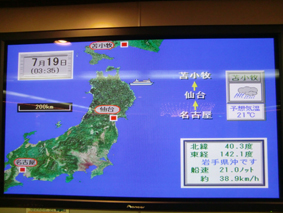 ロビーのテレビモニターには、船の現在位置などが表示されています。 今は・・・青森県沖か 苫小牧の天気は・・・雨?! またカッパ着るのかい! |