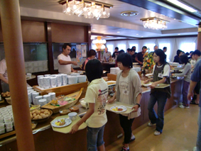 朝食バイキングは7:30から 時間とともにレストランへ 団体の子供たちがすでに並んでいました |