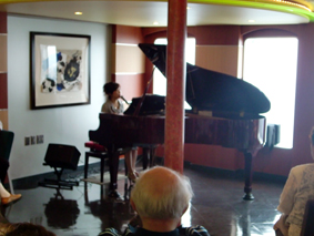 苫小牧港入港寸前 ロビーでは昨日バンドでヴォーカルをやっていた女性がピアノ弾き語りをしていました。 船旅をいっそう盛り上げてくれています。 |