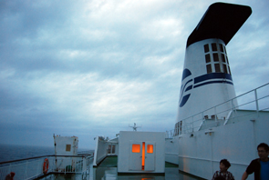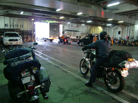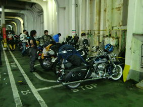バイクをおいてあるE甲板まで降りて、カッパを着込み完全防備! ゲートが開いて、いよいよ北海道上陸です |