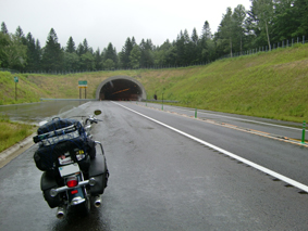 長いトンネルを抜けたとたんに前方が見えないほどの濃霧! でも、まっすぐな道なのでそんなに恐怖は感じない これが日勝峠だったらと思うと、思わず鳥肌が立つ! そのあとは、路面も乾いてきた! |