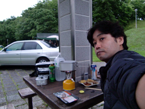 テントを張り終えたとたんに雨がまた降り出した。 ぎりぎりセーフ お次はお米をといで水に浸しておきます ここら辺の段取りは完璧です |