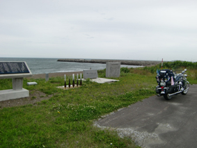 宗谷岬 到着! やっぱり、義務的にここで記念撮影しなくちゃいけないのね(笑) 三脚で撮ろうと思ったら横風が強くて倒れそうなので近くにいた添乗員さんに撮ってもらいました |