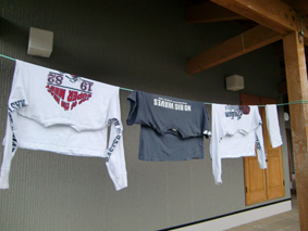 管理人さんに断って、トイレの横の柱にロープを結んでTシャツを干しました。 昨日からの雨でビショビショなので |