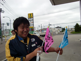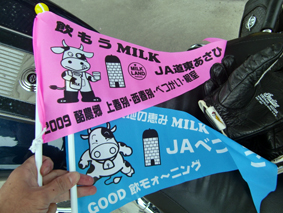 道道8号を延々と走り、別海にあるホクレンへ オリジナルフラッグ、ゲット! しかも去年のももらえました。ラッキ〜! 店員さんに持たせて、パチリ! |