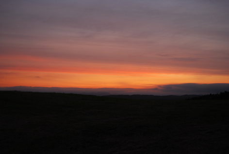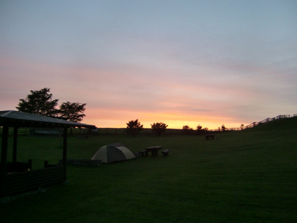 風呂上がりに外に出たら、今まで雲に覆われていた空が切れて、夕焼けが少しのぞいている! 大急ぎでキャンプ場に戻らなくては! |
